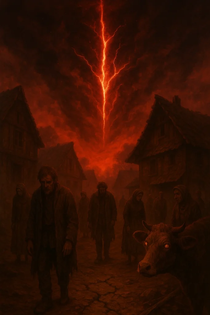 Als ich das Dorf betrat, bemerkte ich sofort, dass es genau unter dem Riss im Firmament lag. Das rote Licht lag wie ein Schleier über allem.